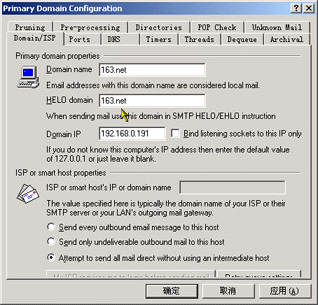 南山答:此时,你的POP3服务器和SMTP服务器地址均只能为MDaemon服务器的IP地址"192.168.0.191";但你的E-Mail地址仍然既可以是"username@192.168.0.191",也可以用"username@163.net"。
