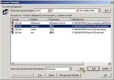 南山(2)接着单击右下侧的"New"(新建)按钮,在随之出现的名为"Account Editor"(帐号编辑器)的窗口中,进入"Account"(帐号)项,在"Full name"(用户全名)下可为任意内容;而"Mailbox name"(邮箱名)处即为邮件用户名,此处填入"nanshan",并确保其后的邮件主机名为"163.net";然后在"Account password"(用户密码)处输入相应内容,最后按"确定"退出。