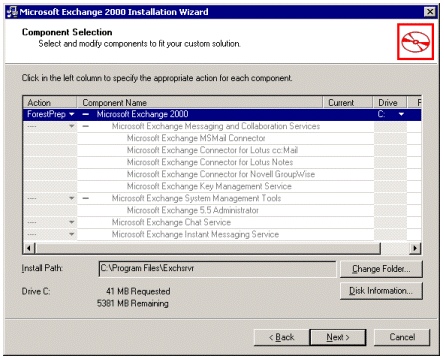 與其他 [安裝]/[ForestPrep] 程序相同,您會看到 [元件選取] 畫面。除了安裝 Exchange 的資料夾位置以外,您無法變更任何設定。您可以使用預設的資料夾。按一下 [下一步] 接受預設安裝路徑,然後繼續執行步驟 6。或按一下 [變更資料夾] 選擇其他路徑。