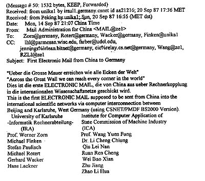 | 第一封电子邮件复印件 邮件题目:中国发出的第一封电子邮件邮件大意:跨越长城,走向世界。这是中国通过北京与德国卡尔斯鲁厄大学之间的网络连接,向全球科学网发出了第一封电子邮件。 |