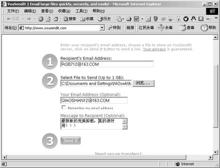 第二步:书写邮件。在“Recipient'S Email Address”(收件人E-mail地址)文本框中输入收件人邮箱地址,点击“Select File to Send (Up To 1GB)”(选择要发送的文件)后面的浏览按钮,打开要发送的文件,文件最大可以达到1GB。在“Your E-mail Address”文本框中输入你自己的E-mail地址,勾选“remember my Email address”(记住我的邮件地址)复选框对邮件地址进行记忆,在“Message to Recipient”(发送的信息)文本框中输入一些简短的留言(如图1)。