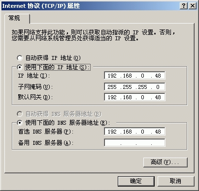 2、如果本机IP地址尚未设定,则在“IP地址”一栏填入“192.168.0.48”;“子网掩码”一栏填入“255.255.255.0”;“默认网关”和“首选DNS服务器”均填入本机的IP地址,即“192.168.0.48”。