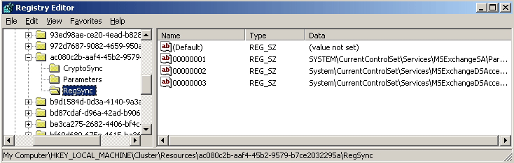 检查点被写入 MSCS 文件夹中的仲裁驱动器。将出现一个以资源 GUID 命名的文件夹。此外,由于每个资源在群集注册表中都有一个条目,您可以精确地看到复制了哪些注册表路径。例如,下面展示了为演示 MSExchangeSA 资源而复制的注册表键。注意,注册表编辑器窗口右侧窗格中列出了注册表路径。