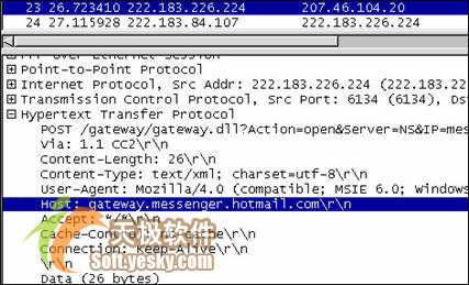 首先来看看HTTP协议登录。可能有人会问:客户端协议是唯一的登录方式吗?其实,当MSN客户端不能以MSN协议进行登录时,它会尝试用HTTP协议方式进行登录。在这种情况下,客户端使用POST命令提交请求,服务器会做出相应的应答。如图5所示,客户端发出了初始请求数据包,直接对象是HTTP方式下的DS服务器Gateway.messenger.hotmail.com,这台服务器实际上与Messenger.hotmail.com是同一台服务器。