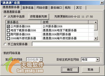 在“通通通服务器”中,选择“从列表中选择”,再从列表框中请根据您是免费用户还是付费用户来选择相应的服务器。注意,免费用户一般选择“公共服务器”,付费用户根据个人网络情况选择:电信服务器或网通服务器或动态中转服务器。在“登录信息框”这一栏中对应的输入登录名和登录密码,也就是在其网站注册的用户名和密码。如图8所示。