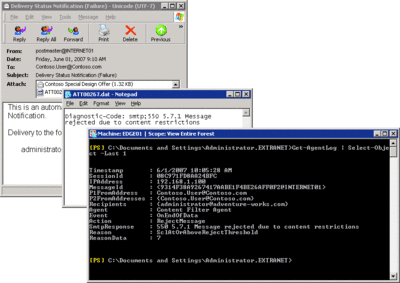 当您运行脚本发送该邮件时,Contoso.User 应该收到 DSN,说明传递失败,其内容如下:Diagnostic-Code:smtp;550 5.7.1 由于内容限制而拒绝了邮件。您还可以在 Internet 主机上的 SMTP 日志中看到该响应,如果在边缘传输服务器上运行命令 Get-AgentLog | Select-Object -Last 1 来显示代理日志中的最后一个条目,您应该能够看到由于其 SCL 分级为 7 而被拒绝的邮件,如图 4 所示。