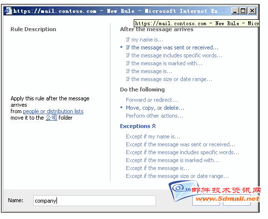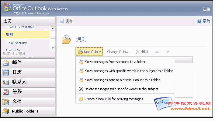 该功能是如何实现的呢?我们来具体看看操作流程。在OWA界面的右上角,我们可以看到一个“选项”按钮,点击进入。然后点击“规则”,点击“新建规则”。这里面提供了5个选项,分别是: