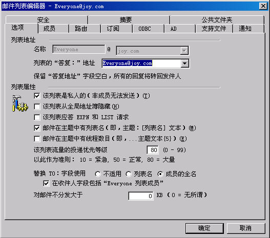2) 检测列表是否已经正确创建:“列表”-“编辑列表”,双击Everyone@域名,可以进行该列表属性编辑