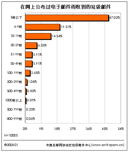据中国互联网协会反垃圾邮件中心(www.anti-spam.cn)最新发布的2007年第四季度反垃圾邮件状况调查报告显示,曾公布过自己邮件地址的用户在每周所收到的垃圾邮件数量中,5封以下的情况最多,占比例的47.02%。收到6-9封垃圾邮件的用户,所占比例为19.51%。而在未公布过自己电子邮件地址的用户中调查显示,这些用户每周所收到的垃圾邮件数量里,5封以下的情况仍占最多比例,其次是6-9封的用户,所占比例为16.43%。