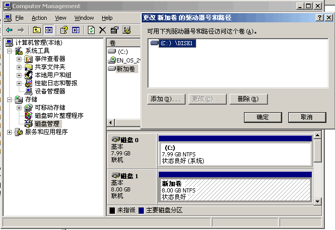 13.打开计算机管理之磁盘管理,更改刚新加的卷驱动器号和路径: