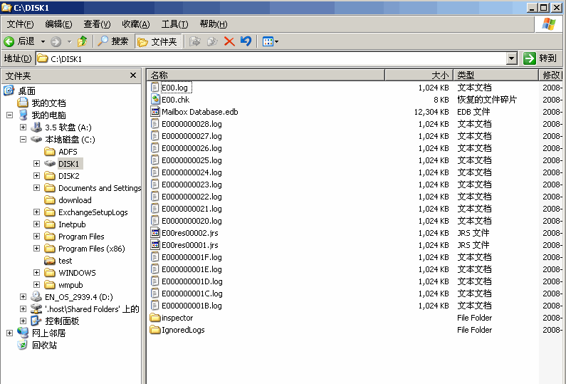 1.为了方便,先将现有的Exchange 2007存储组的数据库及日志移动了DISK1目录。