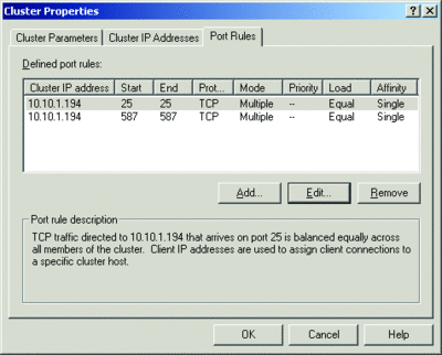 因此,要将 SharePoint 服务器配置为通过 Exchange 2007 SP1 组织中继消息,可以在 Active Directory DNS 中创建一条 DNS 记录,并将它指向可在多台 HT 服务器之间分发流量的硬件负载平衡器,或使用 WNLB 功能来实现此目标。要使用后一种方法,需为 WNLB 群集配置虚拟 IP 地址和 FQDN(如 mail.contoso.com),并在“端口规则”选项卡中添加端口 25(来自非 Exchange 服务器的入站 SMTP 流量)和 587(来自 IMAP 和 POP 之类 Exchange 客户端的入站 SMTP 流量)。图 2 显示了采用此配置的“端口规则”选项卡。还需确保将特定的虚拟 NLB 群集 IP 地址分配给这两条规则,而不是选择所有的 IP 地址。