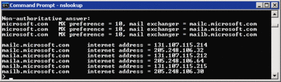 图 3 Microsoft.com 的 MX 记录和 Internet 邮件主机(单击此图像可查看大图)