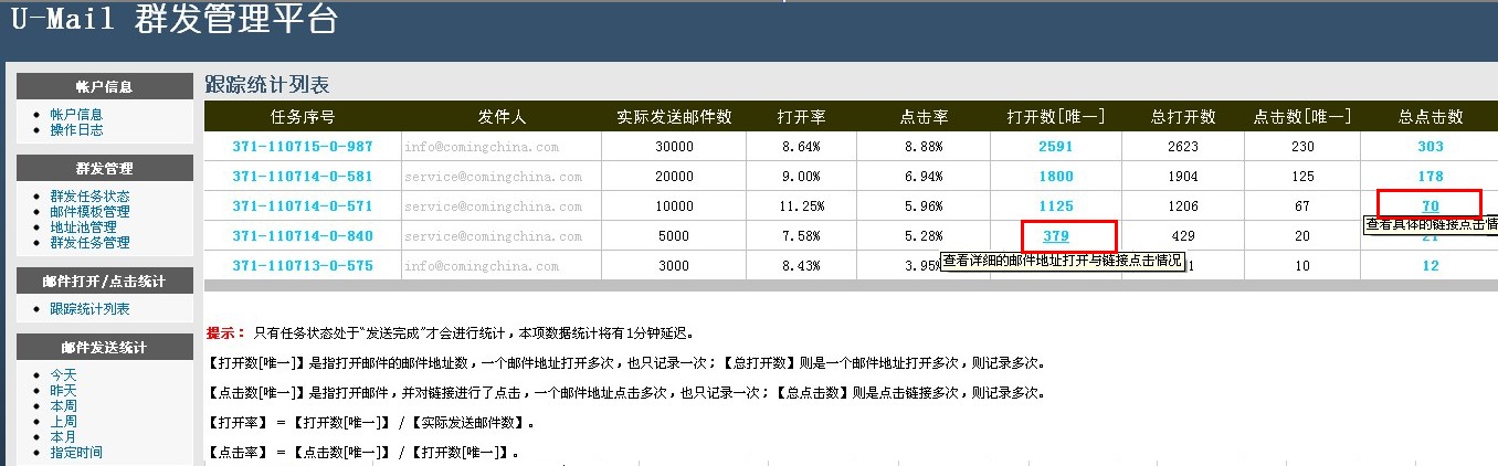 在我们熟知要从邮件标题、内容创意、群*发工具送达率等各方面去改善问题时,更不能忽视每次操作的效果跟踪数据。现将我在U-Mail邮*件*群*发平台的数据跟踪进行演示,主要从开信率和链接点击率来找寻精准用户,和最好的诉求创意。希望在这样的数据分享中,大家能找到更好的营销契机。