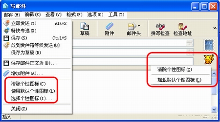 在写邮件窗口,如果觉得当前的个性图标签不太合适,单击签名图像,出现图2所示的提示框,点击“清除个性图标”命令,即可去掉加载的图像,还可以通过“邮件”菜单清除当前图标,或者选择其他图标。