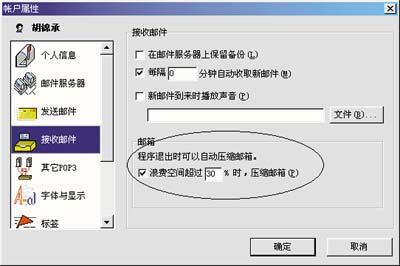 注意,刚才我们谈到在恢复邮件之前最好不要关闭Foxmail,那是因为Foxmail有一项自动压缩邮箱功能。当用户删除的邮件较多,超过了事先规定的比例时,即使用户没有执行“压缩”操作,我们在关闭Foxmail时,系统还是会自动压缩邮箱,这就会给我们对邮件的恢复带来极大的不便。广大用户可执行“选项”选单的“当前账户属性”命令,打开“账户属性”设置框,然后取消“接受邮件”选项卡中的“浪费空间超过**%时压缩邮箱”选项(如图2所示),关闭Foxmail的自动压缩邮箱功能,以便进一步保护邮件的安全。