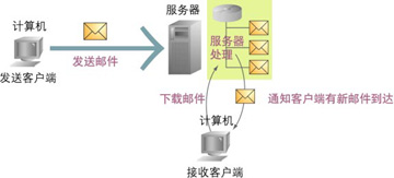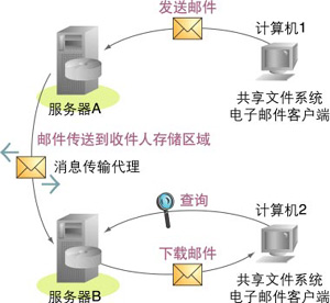 在此模式下,客户端将邮件提交给服务器,服务器端收到邮件后即确定收件人的主服务器,然后将邮件发送到该服务器,接收服务器确定邮件的存储地点并将其放至邮件数据库中,然后通知接收客户端邮件已到达,接收客户端连接到该服务器,并发送接收请求即可。这样,将邮件发送给服务器的客户端就不必访问共享目录了,客户端只与服务器通信以便提交邮件,而服务器也能够通知客户端是否有新邮件到达。