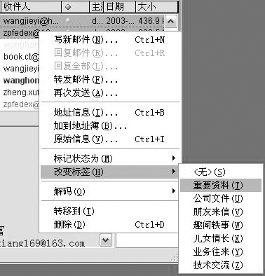 使用“标签”功能时,在Foxmail主窗口的邮件列表中,选择需要使用“标签”的一个或者多个邮件(选择多个邮件时,可以按住Ctrl键的同时,选择多个邮件即可),然后右击鼠标,从弹出的快捷菜单中选择 “改变标签”命令,随之会弹出标签列表,如“重要资料”、“业务往来”、“公司文件”等标签,单击相应的标签选项即可(图1),应用标签后的邮件列表窗口就一目了然了。如果需要取消某些邮件的标签时,可以从标签列表中选择“无”命令即可。