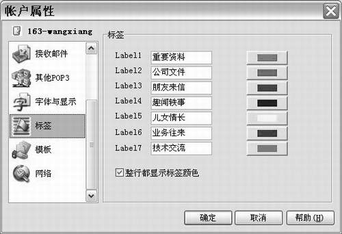 Foxmail具有7个已经定义好的标签,可以根据自己的需要修改标签的名称和颜色。修改时,单击“账户”菜单,选择“属性”命令,在弹出的“账户属性”窗口中,单击“标签”项,然后根据自己的需要修改标签的名称和颜色,最后单击“确定”按钮即可(图4)。如果不希望使用标签的邮件标题整行显示标签颜色,则可以将“账户属性”窗口中的“整行都显示标签颜色”复选框前面的“√”去掉。