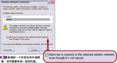 如果第6条技巧中提到的“连接到无线网络”对话框中的“连接”按钮无法使用(是灰色的),该网络可能是缺少“与有线连接相对等的隐私保护”或者更新版本的“Wi-Fi 保护安全连接”。如果您想解决这个问题,可以开启“允许我连接到选择的无线网络,即便是非安全的(见图1)”项目。不过需要注意的是,这个时候您的隐私保护又可能出现问题。