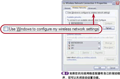 在默认情况下,Windows XP会自动设置您的无线网络连接参数,也就是XP 所谓的“无线网络零设置功能”。但是如果您的无线设备随机附有自己的驱动程序,您最好还是把Windows的这项功能关掉。具体操作是,双击“网络连接”窗口中的“无线网络连接”图标(如第6 条技巧所示),或者点击系统栏里该图标的缩小版。选择“属性”,然后在“无线网络连接属性”对话框中,点击“无线网络”,关闭“使用Windows来配置我的无线网络”,最后点击“确定”(见图2)。