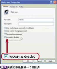 如果某位员工要出一趟远门,长期离开公司,出于安全预防的考虑,您需要更改账户设置,但是您最好是不要直接删除该账户。这是因为以后重新建立该账户时,该员工的账户的权限就都不是以前的配置了,而且该员工也无法使用新账户来访问他自己的加密文件。如果您认为某个账户将来还有可能开启,您最好是关闭该账户而不是整个删除该账户,具体操作如下(在Windows XP的H o m e 版中该功能无法使用): 按Windows-R 组合键,键入“lusrmgr.msc”,然后按回车。点击“用户”文件夹,然后双击您要关闭的账户,打开“关闭该账户”项目,最后点击“确定”(见图3)。如果您之后要重新开启该账户,只要在这里再次关闭该项目即可。