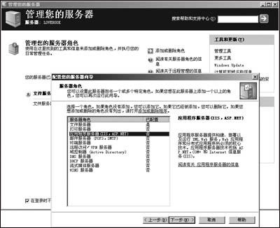 于Virtual Server采用B/S架构,所以需要Web服务器的支持,所以宿主机上必须安装IIS 6.0,方法很简单,只需单击“管理你的服务器”窗口上的“添加或删除角色”任务,然后在打开的对话框上选择“应用程序服务器”选项,再安装屏幕提示一路回车即可,如图1所示。