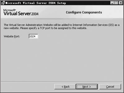 Virtual Server的安装很简单,惟一需要注意的是,在“Configure Components”页面可以指定“Default Web Site Port”(默认Web站点端口)的端口地址,默认是1024,如图2所示。