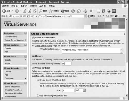 可以看到Virtual Server的Web管理界面很简洁,左侧是任务链接,右侧则是每个任务链接的详细选项。单击左侧Virtual Machines、Create任务链接,在里面输入虚拟机的名称(本例为Windows 2000 Professional)、虚拟机占用的内存(本例为96MB)、虚拟机的硬盘容量(本例为4GB)。还可以指定虚拟机的网卡连接到宿主机的物理网卡。确认无误后,单击右下角的“Create”按钮即可创建虚拟机。
