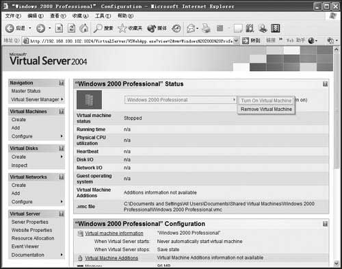 回到Master Status页面上,我们可以看到刚刚创建的Windows 2000 Professional虚拟机正在“待命”,单击“Windows 2000 Professional”菜单、“Turn Virtual Machine”菜单项,如图4所示,即可启动虚拟机。