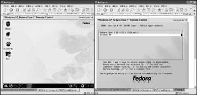 呵呵,想不到吧?在Virtual Server虚拟机里也能安装双重系统!其实很简单,其安装方法和物理机器没有什么两样,只是我们可以通过IE浏览器来远程控制双系统的运行,很酷吧!图6显示在Virtual Server虚拟机里运行Windows XP/Fedora Core 1双系统!