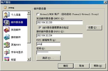 使用Foxmall收发邮件,在解析域名时用时较多,我们可以巧改IP地址,让Foxmail快马加鞭。只要打开“账户”菜单中的“属性”,在弹出的“账户属性”对话框中选中“邮件服务器”,然后在“发送邮件服务器(SMTP)”和“接收邮件服务器(POP3)”框中,直接键入邮件服务器的IP地址,即可省去Foxmall的域名解析环节,从而加快邮件的收发速度。比如将“smtp.elong.com”改为“202.104.32.230”,将“pop3.elong.com”改为“202.104.32.234”(图2),即可省去解析IP地址的过程,达到为Foxmail提速的目的。