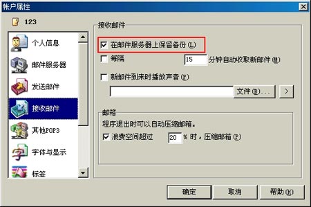 方法是:执行“账户”菜单中的“属性”命令,打开“账户属性”对话框,单击“接收邮件”,并选定“在邮件服务器上保留备份”选项(图5)。