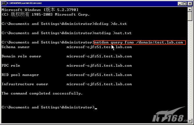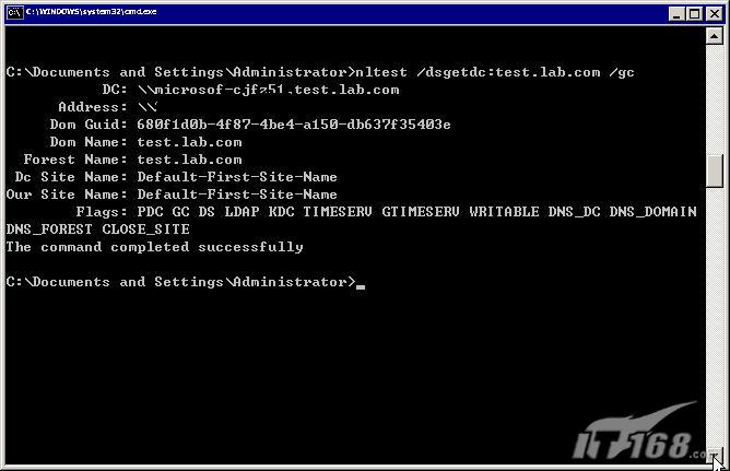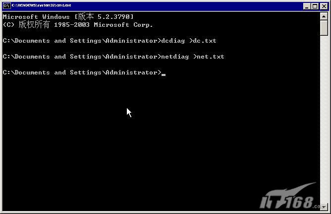 5、检查活动目录和网络环境 在DOS环境下用dcdialg工具检测活动目录的运行情况,如下图,用netdiag工具检测网络环境运行状况,如下图: