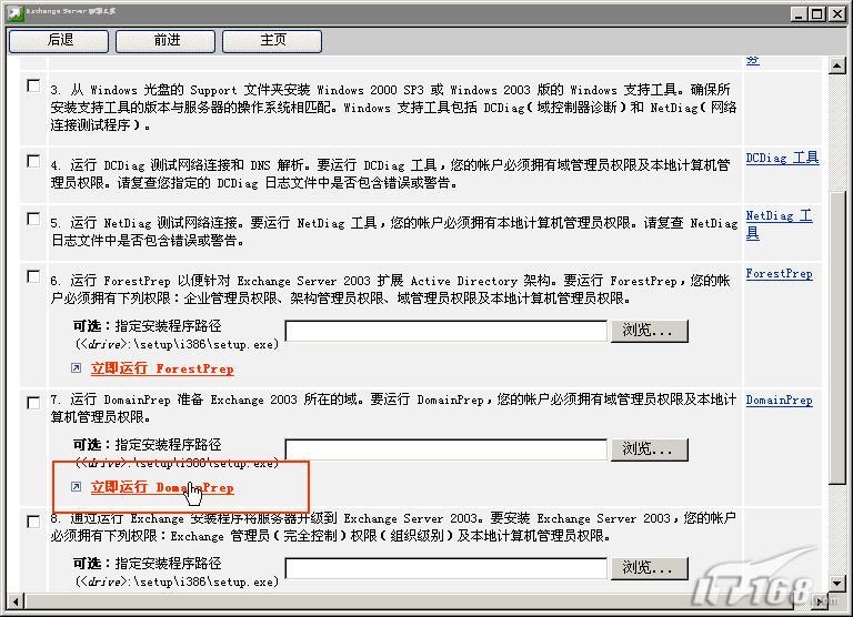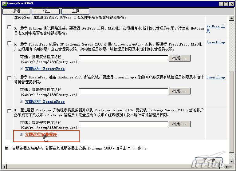 图中左边是关于Exchange的一些信息以及微软网站上关于Exchange的一些链接,可以在安装之前仔细阅读一下,加深对Exchange server的了解。图中右边是Exchange 2003的一个部署工具。点击部署工具,根据自己实际工作场景和环境选择合适的安装方式。我们在此选择安装全新的Exchange2003服务器,然后出现安装任务别表,如下图: