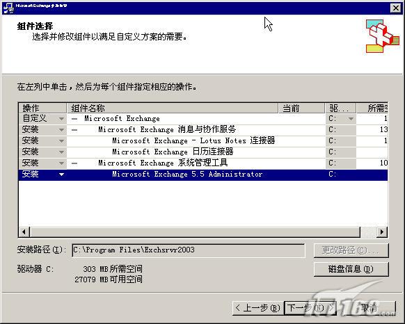 8、安装Exchange服务组件 最后我们进行安装Exchange服务器组件的最后一步即安装Exchange服务组件,我们首先用在森林拓展的时候指定的管理帐号登陆,然后在安装向导中运行立即运行安装程序,会打开Exchange安装向导,根据实际请选选择相应的组件,其中Exchange消息与协作服务是Exchange的核心组件,Lotus Notes连接器主要用于与Notes服务器的共存或迁移。日历连接器用户同步Notes服务器上的日历信息。Exchange系统管理工具用户管理Exchange server 2003。Exchange 5.5 Administrator用户管理Exchange5.5服务器。