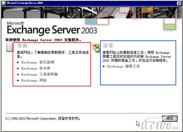 然后用刚刚创建的Exchange管理员帐号登陆的域服务器上,插入Exchange 2003安装光盘,如果您的光驱支持自动播放,则会出现如下界面,如果不支持,可以点击光盘下的setup.exe调出如下界面。