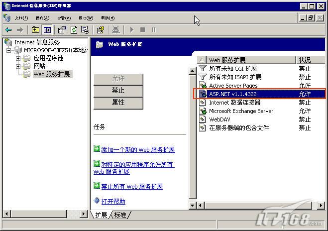 除此之外确认ASP.NET组件已经正常工作,在IIS的【Web服务扩展】中查看ASP.NET是否已经允许。如下图: