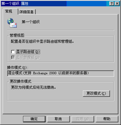 图 2.1 "常规"选项卡中的"更改模式"选项 有关纯模式和混合模式的详细信息,请参阅"Exchange Server 2003 部署指南"(http://go.microsoft.com/fwlink/?LinkId=21768) 和"规划 Exchange Server 2003 邮件系统"(http://go.microsoft.com/fwlink/?LinkId=21766)。
