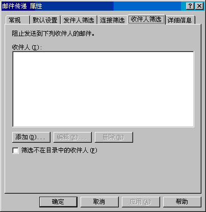 图 2.10 "邮件传递属性"对话框中的"收件人筛选"选项卡 创建和管理管理组 在 Exchange 5.5(及更早版本)中,站点同时定义一组服务器的管理边界和物理路由拓扑。Exchange 2000(及更高版本)将站点的概念分成了物理和逻辑两部分,具体如下: