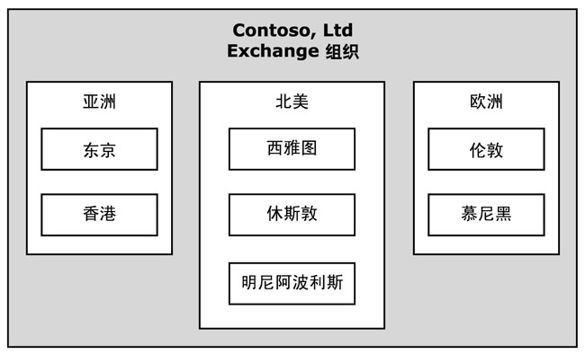 为了解释这些管理模型,以下各节展示了在一个名为 Contoso, Ltd. 的虚构公司中是如何应用上述每一种模型的。此虚构公司在北美、欧洲和亚洲都拥有全球性的分支机构,如图 2.11 所示。