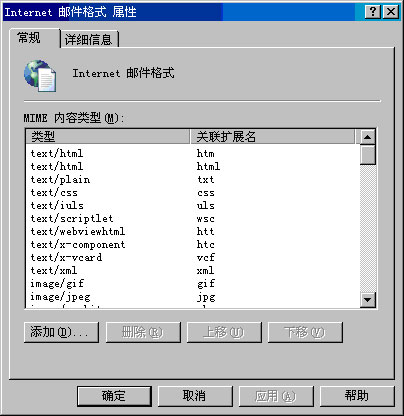 将文件扩展名与 MIME 相关联 当向/从 Internet 客户端发送/接收邮件时,使用 Internet 邮件格式。当用户从 MAPI 客户端(如 Microsoft Outlook?)向 Internet 客户端(如 Outlook Express)发送邮件时,SMTP 将邮件从 Microsoft RTF格式转换为 MIME。为每个 MIME 类型定义的文件扩展名使客户端可以识别并打开邮件附件。默认情况下,有几种内容类型与文件扩展名关联。通常,对于内容转换而言,默认关联已足够。