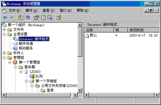 管理文件扩展名关联 1. 在 Exchange 系统管理器中,展开"全局设置",用鼠标右键单击"Internet 邮件格式",然后单击"属性"。