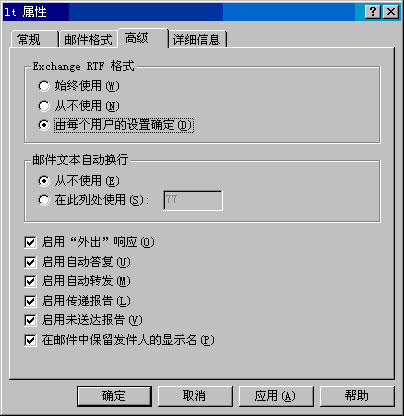 注意 前面已指出,当为某个域配置策略时,除非该域的用户始终使用 MAPI 客户端,否则不要选择"Exchange RTF 格式"下的"始终使用"。