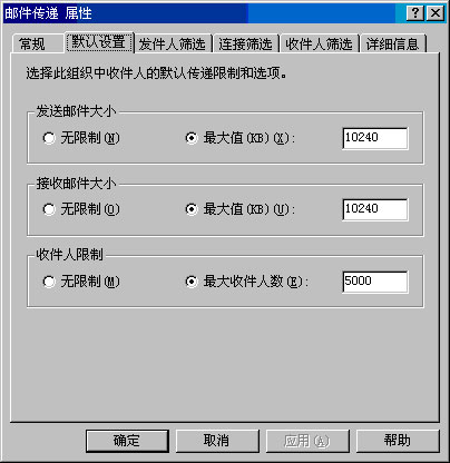 · 默认邮件传递选项(包括发送和接收邮件时的邮件大小限制,以及邮件最多可以有多少个收件人)。