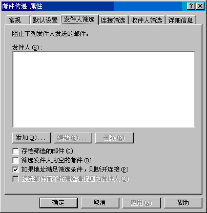 图 2.8 "邮件传递属性"对话框中的"发件人筛选"选项卡 2. 要使 Exchange 将发件人筛选阻止的所有邮件保存到存档文件夹中(而不是自动删除被筛选掉的这些邮件),请选择"存档筛选的邮件"。