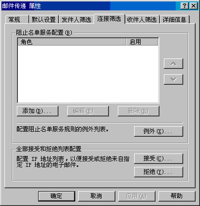 创建全局接受列表或拒绝列表 · 在"邮件传递属性"对话框的"连接筛选"选项卡(见图 2.9)上,单击"接受"将某个 IP 地址添加到全局接受列表中,或单击"拒绝"将某个 IP 地址添加到全局拒绝列表中。