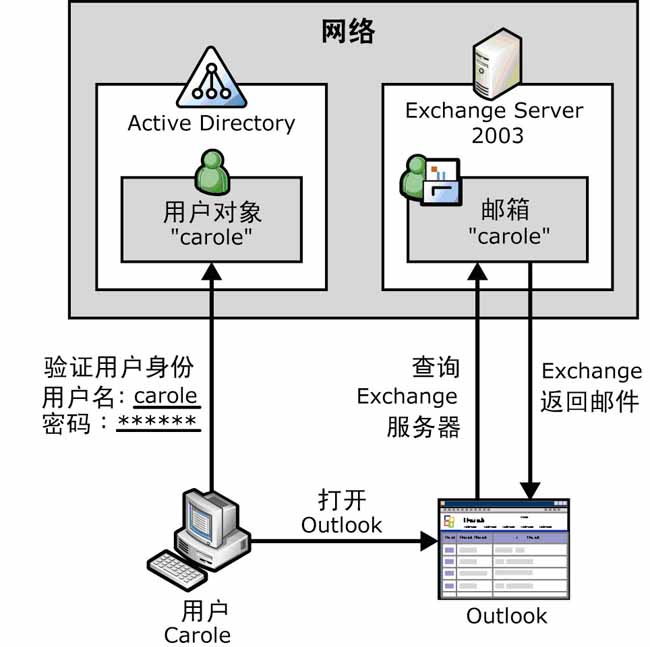 下面的方案说明了接收电子邮件的人与 Active Directory 对象之间的区别。Carole 是市场组的成员,她有一个用户帐户,这个帐户提示她键入用户名和密码,以便登录到她的计算机和她公司的网络。登录后,她便可以访问若干个网络资源。其中之一是她的 Exchange 邮箱。Carole 使用电子邮件客户端 Outlook 2002 访问她的邮箱。Outlook 查询 Carole 的 Exchange 邮箱,并在她的 Outlook 收件箱中显示邮件列表。当 Carole 打开其中的某个邮件时,Outlook 会从 Exchange 服务器上驻留她的邮箱的邮件存储中检索该邮件的内容。
