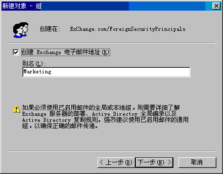 已启用邮件的组代表收件人对象集合。其目的是加速邮件分发到多个电子邮件地址的过程。可以像创建其他任何收件人对象一样创建组。但是需注意的是,默认情况下不会对组选择"创建 Exchange 电子邮件地址"。要对组启用邮件,应在创建组的过程中选择"创建 Exchange 电子邮件地址"(见图 4.6)。