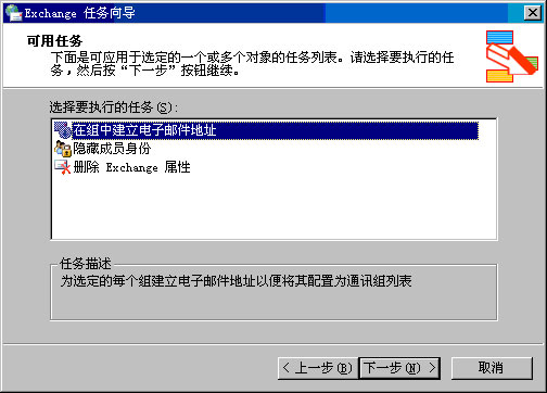 2. 在"Exchange 任务向导"的"可用任务"页中(见图 4.7),选择"在组中建立电子邮件地址"。